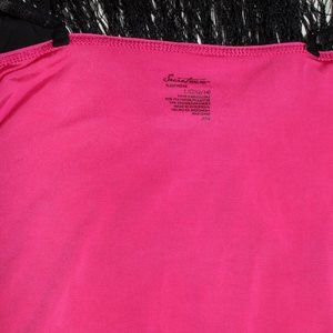 Bright Pink Nightie Slip with black fringe. Black straps. Size Large. Front black front inset. Hangs for comfort.