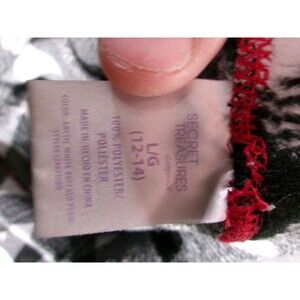 Pre-owned Secret Treasures fleece sleep pants in good condition with normal light surface wear and minimal pilling at high-contact areas. Tag reads L/G (12-14) and fabric is 100% polyester; elastic waist with drawstring. See photos for close-up of condition and details.