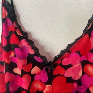Vibrant pink and red heart print slip with black lace trim. Lightweight nylon fabric with adjustable straps for fit. Tagged XXL but works as a short slip dress or lingerie piece — can be styled as a fun, spicy mini dress or layered for Y2K vibes.