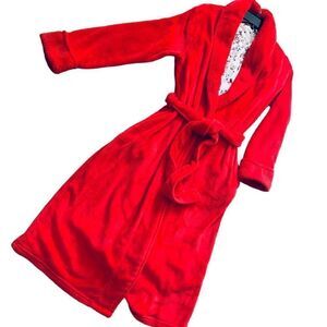 Pretty winter white plush velour red cardinal print night gown. Button v-neck. Polyester/spandex. Super soft & cozy. Red plush robe with belted tie waist. Side hand pockets. The pockets do have some minor pilling on the inside. Please see last 2 photos for details. 100% polyester fabric. Both in great preowned condition. Secret Treasures Size Medium