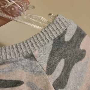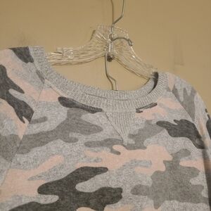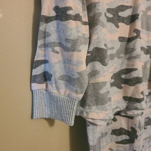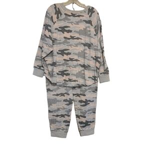 Women's soft, camo print, two-piece pants PJ set from Secret Treasures, size XL. Scoopneck slouchy top, pullon style pants with drawstring and slant pockets on pants. Polyester and spandex fabric blend; ribbing around collar, wrists and bottom hems. Great for lounging around the house or cuddled in front of the television. Excellent pre-owned condition; no flaws.