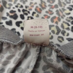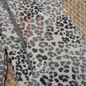 Cute pants for casual lounging or to use as pajama pants. White fabric with a rainbow leopard print with a gray waistband and drawstring.