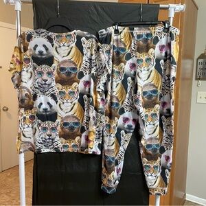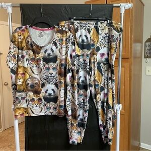 Vibrant pajama set with animal faces in sunglasses. Soft and comfortable for a cozy night. No visible flaws; excellent preowned condition. Approximate measurements below: