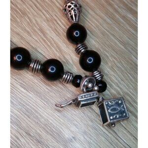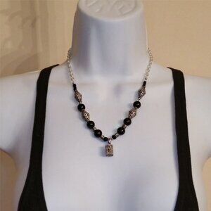 Black beads on a silver tone chain with secret box locket. Romantic goth/gothic style.