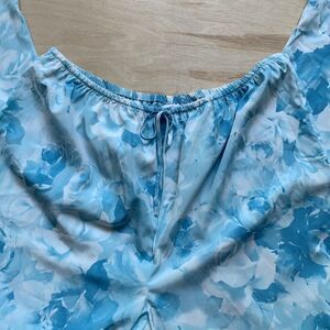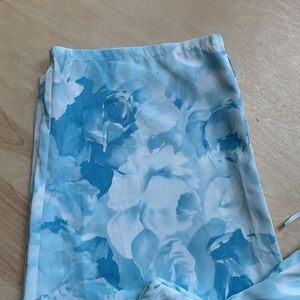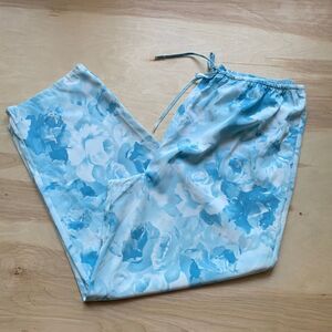 Pretty Secret Treasures sleep pants are light blue with flowers all over. Pretty enough to be worn as pants! 100% polyester. Elastic waist with drawstring. Good amount of stretch. Waist flat across is 16”. Hips flat across is 26”. Inseam is 29”.