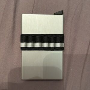Steel color, aluminum material, fits 4-6 cards, Unwanted RFID/NFC communication protection, mechanical, minimalistic, casing protects cards from breaking or bending. Weighs 48 grams and is 102 x 63 x 8 mm. Ethically made in Holland.