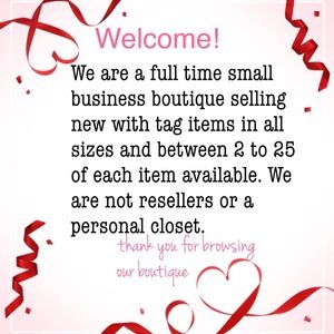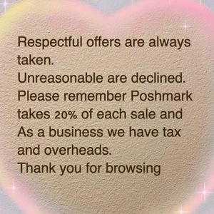 We are a licensed full time ®️ online business, please be respectful if making an offer- we are not downsizing a personal closet or resellers, we pay tax and run a warehouse with staff. Also we pay 20% for each sale to Poshmark.