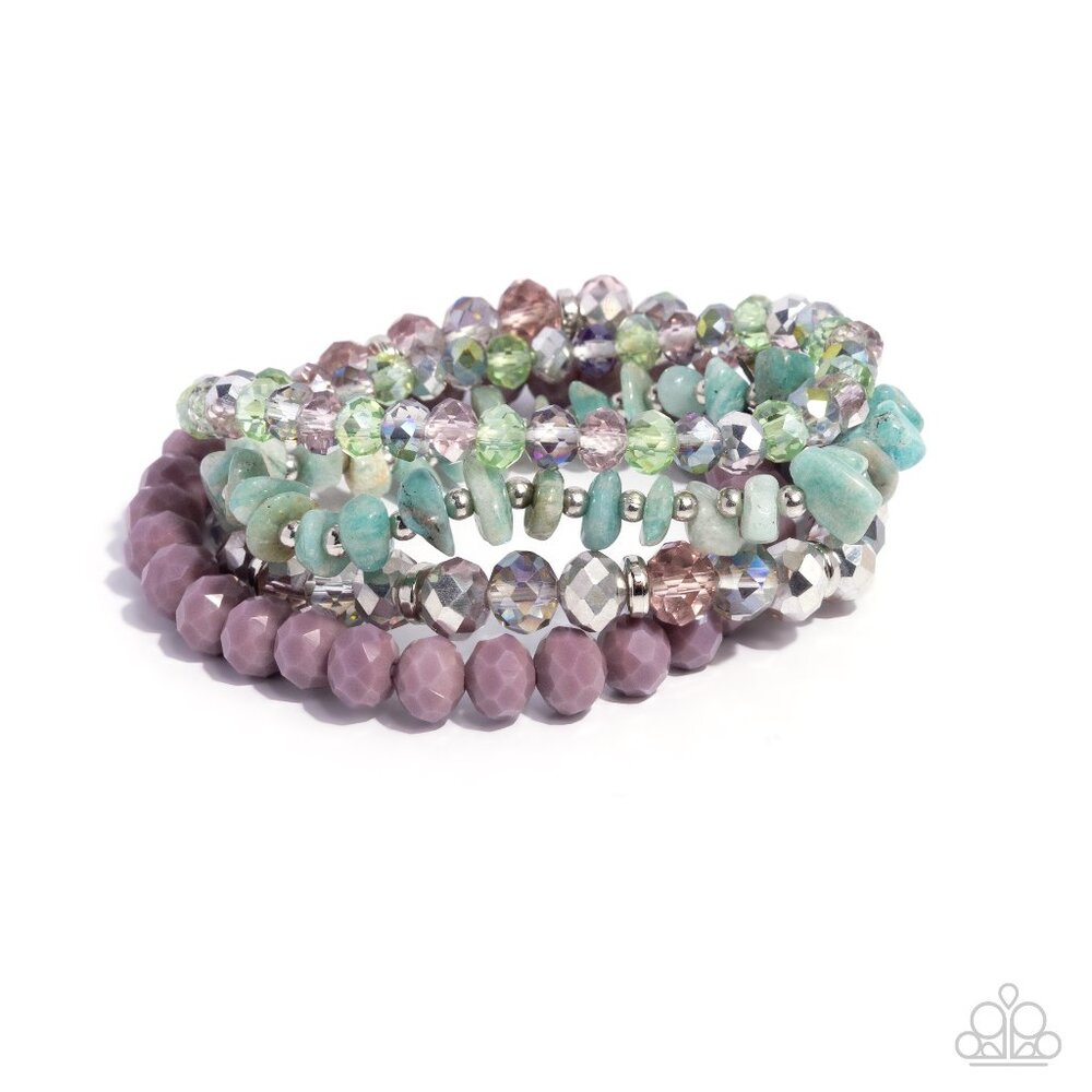 Infused along elastic stretchy bands, a collection of faceted purple beads, chiseled green stones, silver studs, purple multicolored and UV shimmery beads, and a silver geode pattern and coalesce atop the wrist for a stony shimmery stack. Due to its prismatic palette, color may vary.