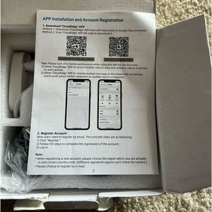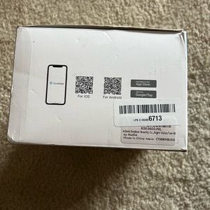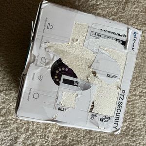 Brand new camera, box is distress. All pieces are here. Bought it and did not notice it is a outside security camera and we live in an apartment!