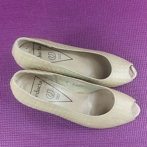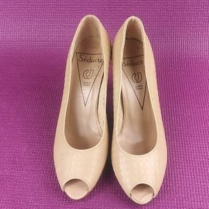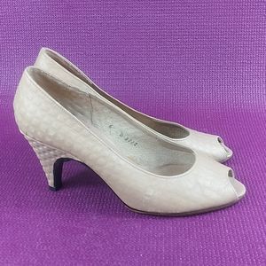 Seducta 6 peeptoe heel. Nude leather upper. Quilted pattern. 2.75" heel. Made in France. EUC.