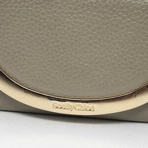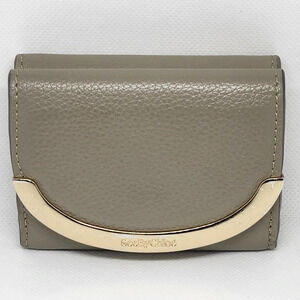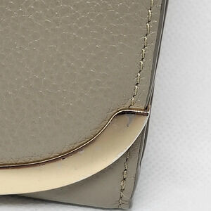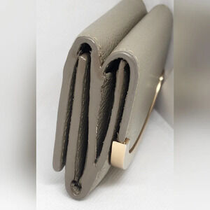 Taupe leather with gold tone trim. In excellent pre-owned condition, few small spots on gold that has peeled, pictured. Snaps on both sides work great, one side is a pocket for coins, other side opens as a bill compartment with 3 card slots. Measures 4x3"