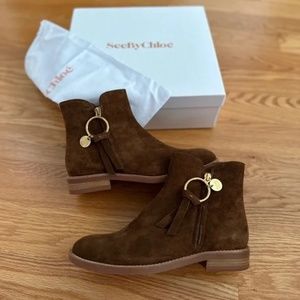 Brand new in Box! Beautiful suede booties from See By Chloé . See By Chloé Louise Flat Suede Ankle Boots In Savana--like a Chestnut Brown. Soft suede & cool hardware. As per the website 38 is equivalent to a US 8. The stock photos at the end are the booties in different colors but show the fit. Logo-engraved hardware adds a playful charm to these flat ankle boots.