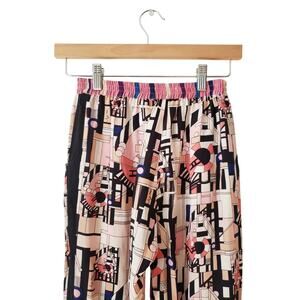 Style: Pull-on, striped/abstract print pants. Elastic waist. Has pockets. High rise. Straight leg. 100% silk.