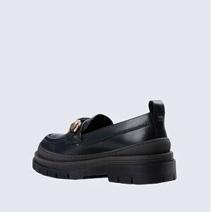 Elegant black loafers with gold detailing. Chunky sole for comfort. Stylish and versatile.