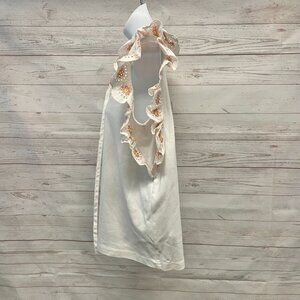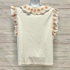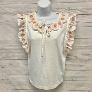 white with eyelet embroidery flutter/ruffle detail on collar and sleeves
