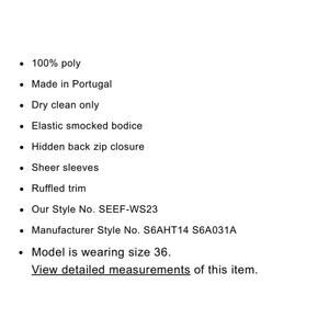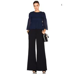 Elegant See By Chloé peasant blouse featuring a smocked bodice, sheer flowy sleeves, hidden back zip closure, and a gently flared hem. Dark navy chiffon creates a romantic, elevated boho look.