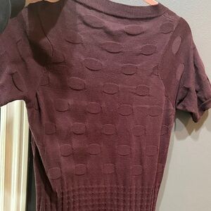 Elegant dark brown mini dress with short sleeves. Features a flattering fit and flare silhouette. Ideal for chic occasions.