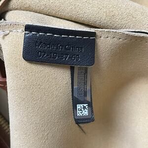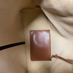 • Features: Comes with dust bag and card of authenticity, Glossy black leather exterior, Double handles, Open top, Beige color suede lining, Attached interior zipper pouch, Light browm / tan logo tag charm on front, Gold toned hardware