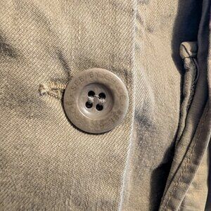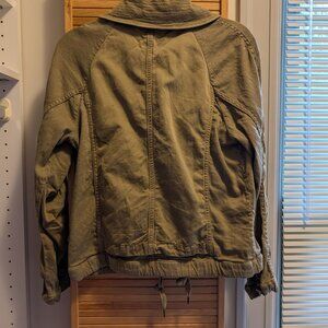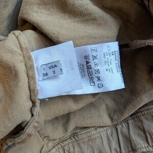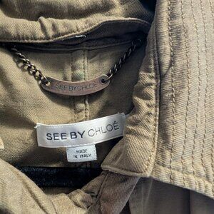 See By Chloe brand olive green military/bomber/utility jacket. Button front. Drawstring at bottom to optionally cinch. 67% linen, 31% cotton, 2% elastane. Made in Italy. Size is an IT 38, US 2. It has a relaxed fit that would fit any XS. EUC, no stains or holes, some texture to the fabric as is typical of linen.