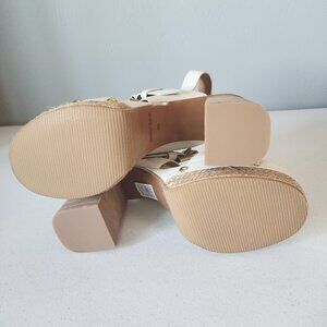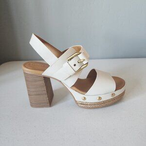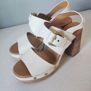"NEW" Gorgeous Looking Creamy White Leather Sandals By See By Chloe. Adjustable Top Buckle, Wide Leather Strapping with Gold-tone Studded Accent, Jute & Leather Wrapped 1.5" Platform & Stacked 3.5" Block Style Heel, Rubber Grip Soles, Leather Upper, Lining & Cushioned Footbed, New, Never Worn, Only Tried On:) Rt.450.00 approx. Size 40/ 9, Foot Bed Measures 10.1/4" for Reference. * Perfect Neutral Shoe for any Occasion.