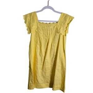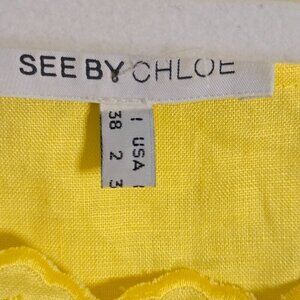 See By Chloe Y2K Yellow Linen Embroidered Mini Dress Size 2. Pit to pit 18", shoulder to hem 32", Designer, Pin Tuck Square Neckline, Scalloped Trim, Cap Ruffle Shirt Sleeves, Tone On Tone Embroidered, Tiny Faint Spot as pictured. Good Pre-Owned Condition