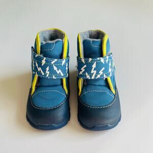 Keep little feet warm and cozy with these See Kai Run insulated boots, toddler size 6. Designed in blue with yellow accents and white lightning bolt strap details, these boots are both stylish and practical. Features a durable rubber sole, Velcro closure for easy on/off, and warm insulation lining to protect against cold weather.