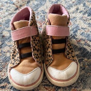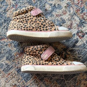 Leopard print sneakers with pink straps. Stylish and fun for kids.