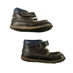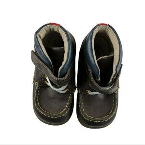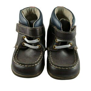 Dark brown Velcro closure ankle height boot with rubber sole. Elastic laces for adjustable fit. Very good used condition. No issues with the velcro, light sole wear at the heel. See pictures for additional detail. Approved by the American Podiatric medical association to promote healthy foot development.
