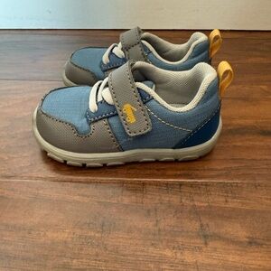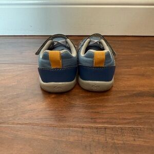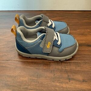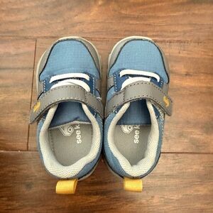 These See Kai Run sneakers combine a vibrant blue and gray color scheme with a practical hook-and-loop velcro strap for easy fastening. Designed with a breathable mesh material and a durable gray rubber sole, they offer both comfort and traction for active play. The low-top design and padded ankle area ensure a snug fit, making them ideal for everyday adventures. These shoes are gently used and in excellent condition. All of my items are well cared for and come from a smoke free home.