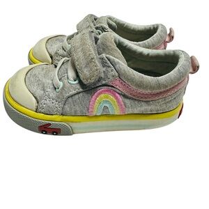 Adorable and comfy See Kai Run toddler sneakers in size 5. These shoes feature a soft gray fabric upper, fun rainbow embroidery on the side, and cheerful yellow trim. Double hook-and-loop (Velcro) straps make for easy on/off, and the flexible rubber soles are perfect for growing feet on the move!