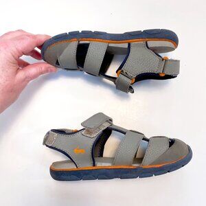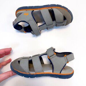 Our Wilder water-friendly outdoor sandals in gray with navy and orange accents are perfect for little adventurers who love the water! With a rugged outsole featuring a large lug traction pattern and a durable rubber toe cap for extra protection, these sandals are made to last. With two points of adjustability for a secure fit and a cushy, soft footbed, they're also comfortable enough for all-day play at camp.