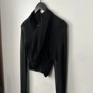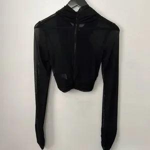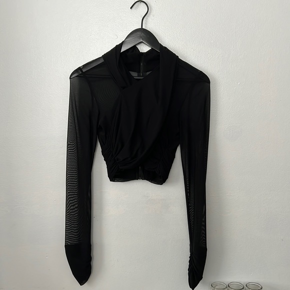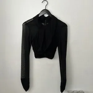 Black see through blouse Back zipper Cropped fit Excellent condition Only worn once Stretchy