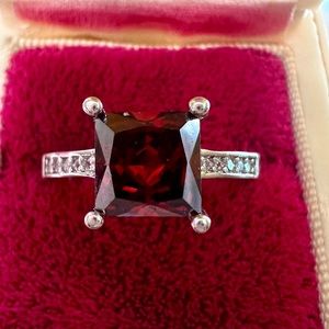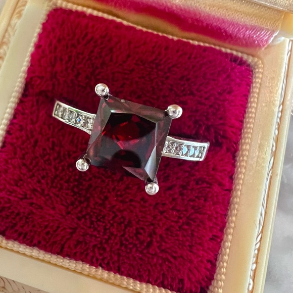 āļø New Silver Dark Red Garnet Ring Princess cut Diamond Ring. Size is about 7.75. High shine finish. Please see all pictures, they are part of the description. There is a small stamp inside I canāt read. Nice quality and looks real. Classic solitaire simulated Garnet in a 4 prong setting. Sides cz diamonds and a comfortable band. In excellent condition! Trusted seller/ fast shipping/ good customer service! You pay for priority mail so I make it my priority to get an order out as soon as possible! I ship Monday-Saturday. My post office closes early on Saturday so orders must be placed Friday night to go out Saturday!š