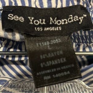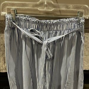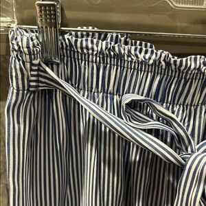Wide leg pants with blue and white stripes. Relaxed fit, elastic waist and attached sash