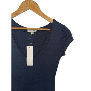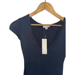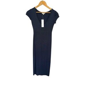 Navy Blue Bodycon Midi Dress Cap Sleeve V Neck Minimalist Womens M NWT