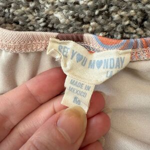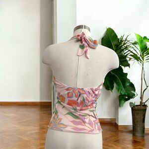 See you Monday floral pink green floral tropical knit mesh chiffon halter top. Cropped length. Stretchy.