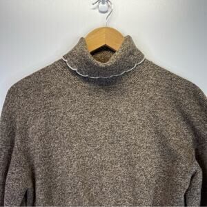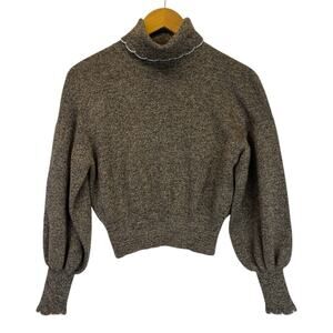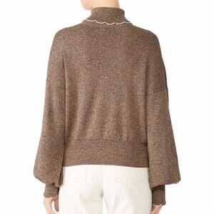 See by Chloé Chestnut Turtleneck Sweater in brown. Crafted from soft knit fabric, it features a classic turtleneck and long, voluminous sleeves that add effortless drama to the relaxed silhouette. Delicate scalloped trim details lend a sweet, signature finish, making this sweater a standout choice for both comfort and style on cooler days.