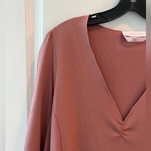 Pink silk crepe de chine (98% Polyester, 2% Elastane). Long sleeves. V-neckline. Shift with adjustable tie waist. Slip lining.
