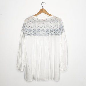 Super sweet, light and airy long-sleeved eyelet blouse. Pure white with ice blue/gray stitching.