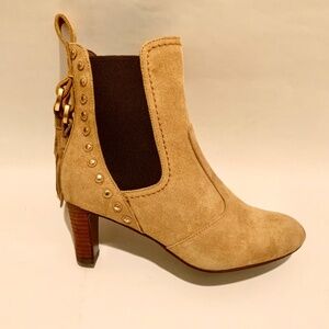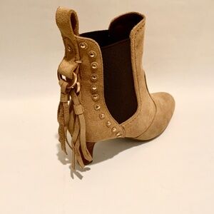 See by Chloé Medium Beige Tan Suede Tasseled Studded Booties Nude Leather Heeled Chelsea Ankle Boots