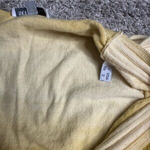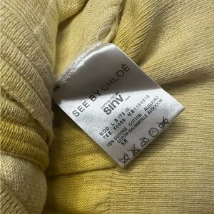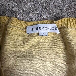 This adorable yellow cardigan sweater from See by Chloe is the perfect spring transition sweater. It is a fitted fit slightly cropped, fall the waist. The buttons have See by Chloe written on all of them. Two pockets, a V neck and different colors of yellow, making the stripes.