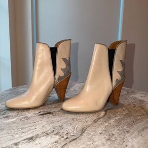 Step into contemporary chic with these See by Chloé ankle boots, crafted from smooth beige leather with distinctive contrast suede panels and elastic side inserts. Featuring a pointed toe and a sculpted wooden block heel, these boots offer both comfort and elevated style. Perfect for pairing with jeans, dresses, or skirts, they bring a modern edge to any outfit while staying true to the bohemian-luxury aesthetic of See by Chloé.