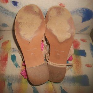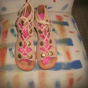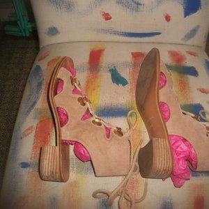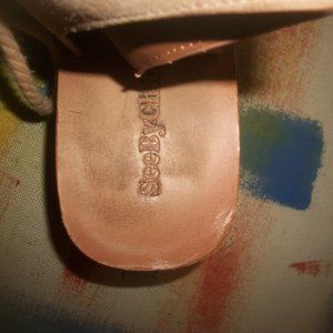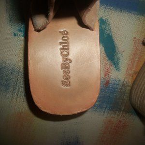 From See by Chloe a pair of "Edna" beige-suede gladiator sandals with large gold-metal studs, sexy cut-out design and rubber-reinforced stacked wood chunky 1.5" heels. When these are off they kind of do not make sense! But on -- oh la la -- just fabulous -- very "funky-chic" - almost like gladiator -clogs -- with rope tie that goes around the ankle and up the leg & leather soles and insoles. These have moderate - to medium wear -- nothing major -- just a few darker marks on the suede and moderate wear on soles and heels. Marked 38.5. Heel 1.5" Width 3.75" Insole 10"