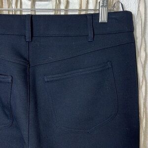Navy trouser, front and back pockets, belt loops, slight ankle flare