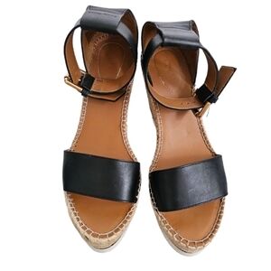 See by Chloé "Glen" black espadrille platform wedges with gold ankle buckle.
