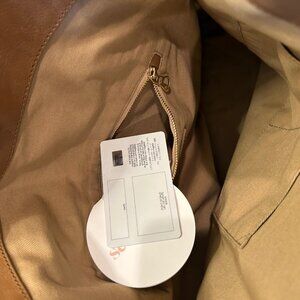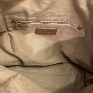 A vertical zip opens a side pocket, & double rolled handles slide over the shoulder. A magnetic snap opens the roomy, lined interior w/ 3 pockets. I love this bag because it is functional yet sleek and sophisticated. The leather on her is in excellent condition. The interior is in great condition as well.