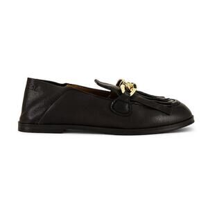 Mahe leather loafer in goatskin with a tunit rubber sole. The See By Chloé-engraved enamel chain and fringed detail bring a dandy appeal while the fold-down heel ensures a laid-back attitude.