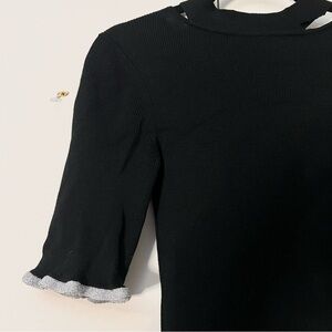 Black knit (100% Wool). Hourglass. Short sleeves. High neck with tie.