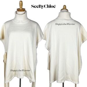 See by Chloe pretty ivory/cream pullover poncho with off white whipstitched edges, tie sides & relaxed turtleneck is perfect for transitional weather over denim or maxi skirt. EUC. Size small, but fully adjustable to accommodate most sizes. See photos for measurements.