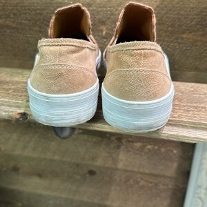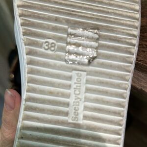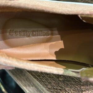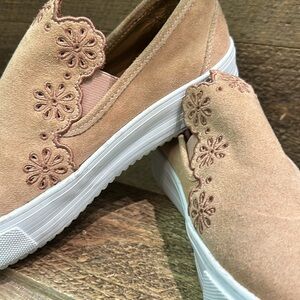 These See by Chloé pink suede slip-on sneakers are in excellent used condition (EUC). With their delicate floral cutout design and comfortable white rubber sole, they are perfect for adding a touch of elegance to casual outfits.